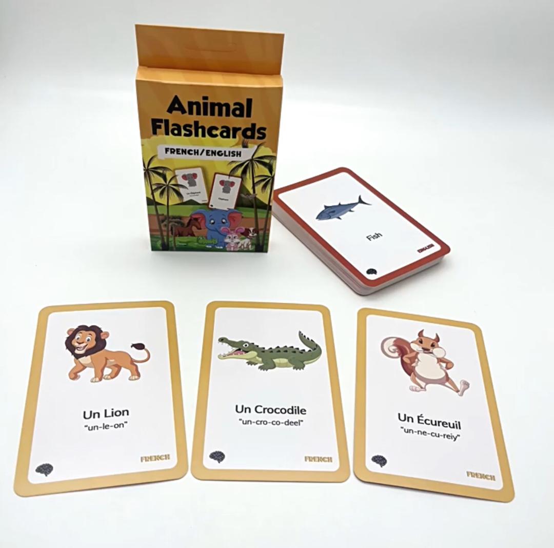 This product contains cards with pictorial illustration of the animals with their names in English and French, it is best for teaching children to get familiar with names of animals and their pronunciation in English and French.