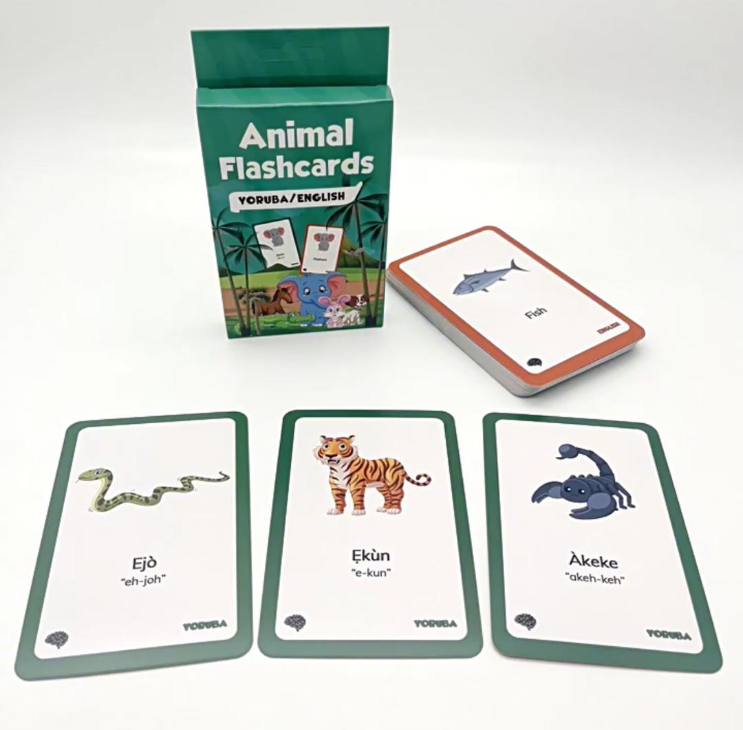 This product contains cards with pictorial illustration of the animals with their names in English and Yoruba, it is best for teaching children to get familiar with names of animals and their pronunciation in English and Yoruba.
